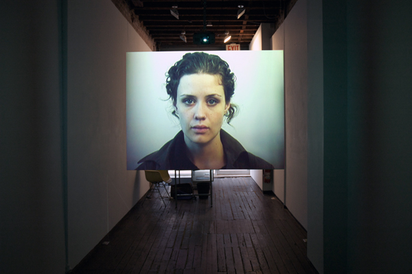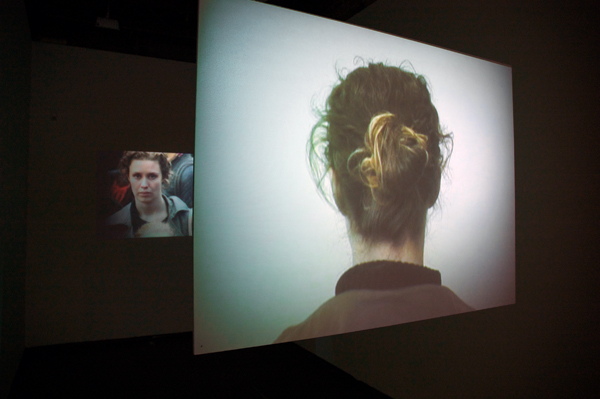 The audience's initial view of the installation is the back of the protagonist’s head. When walking around the screen the viewer is placed in the middle of two opposing videos showing the same protagonist in different environments. The videos show the protagonist's two observing perspectives: one from inside the gallery space, the other from the sidelines of Occupy Wall Street. The videos function as mirror images of one another. In them, the protagonist looks at the audience, at herself looking at protestors, and at herself in the white space.